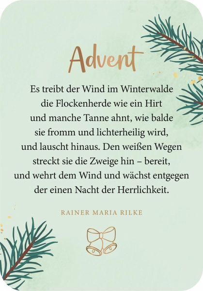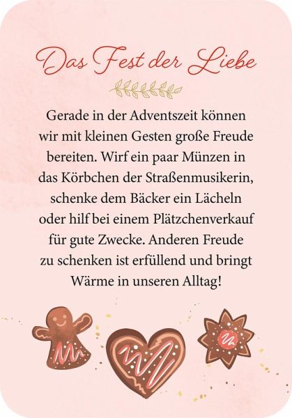 Finde Ruhe im Adventstrubel: Einfach eine Karte ziehen und verzaubern lassenTägliche Inspiration: Die 24 schön gestalteten Karten enthalten weihnachtliche Impulse - für mehr Entschleunigung in der AdventszeitHochwertige Gestaltung im handlichen Format: Liebevoll illustrierte Karten und eine stabile Kartenbox mit Goldfolienveredelung fangen die festliche Weihnachtsstimmung einEin wunderbares Geschenk: Der perfekte Adventskalender, um lieben Menschen eine Freude zu machen