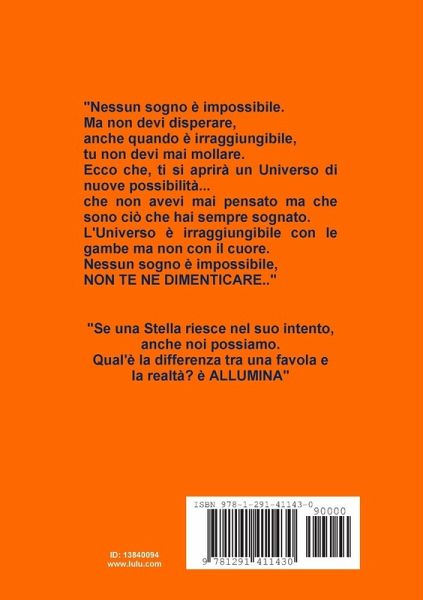 ALLUMINA E' UNA STELLA. HA UN AMICA, DUBHE, CHE FA PARTE DELLA COSTELLAZIONE DELL'ORSA MAGGIORE. AD ALLUMINA PIACE OSSERVARE LA TERRA, TROVA SPETTACOLARI I SUOI ABITANTI MA A VOLTE NON LI CAPISCE, NON COMPRENDE IL LORO FARE E DISFARE E SPESSO NE RIMANE DELUSA. ANCHE LEI COME LORO E' ALLA RICERCA DI QUALCOSA, NON SA COSA DI PRECISO, NONOSTANTE ABITI IN UNA BELLISSIMA GALASSIA, LA VIA LATTEA. UN GIORNO DECIDE DI ALLONTANARSI DAL SUO PUNTO D'ORIGINE E DI AVVENTURARSI VERSO L'INFINITO UNIVERSO. DURANTE IL VIAGGIO INCONTRA CESPUGLIO UN EX PIANETA, CHE LE FA CAPIRE QUALCOSA DI IMPORTANTE. IL PIANETA NASCONDE UN SEGRETO CHE E' UNA GRANDE VERITA': E'CON IL BUIO CHE SI RICONOSCE LA LUCE. QUESTA STORIA E' UNA METAFORA, E' UNA FAVOLA REALE CHE FA RIFLETTERE, CHE CERCA DI DARE UN MESSAGGIO IMPORTANTE.