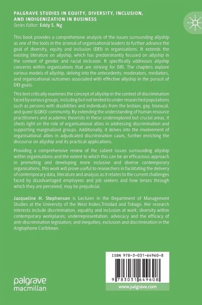 This book provides a comprehensive analysis of the issues surrounding allyship as one of the tools in the arsenal of organisational leaders to further advance the goal of diversity, equity and inclusion (DEI) in organisations. It extends the existing literature on allyship, which has predominantly focused on allyship in the context of gender and racial inclusion. It specifically addresses allyship concerns within organizations that are striving for DEI. The chapters explore various models of allyship, delving into the antecedents, moderators, mediators, and organizational outcomes associated with effective allyship in the pursuit of DEI goals.