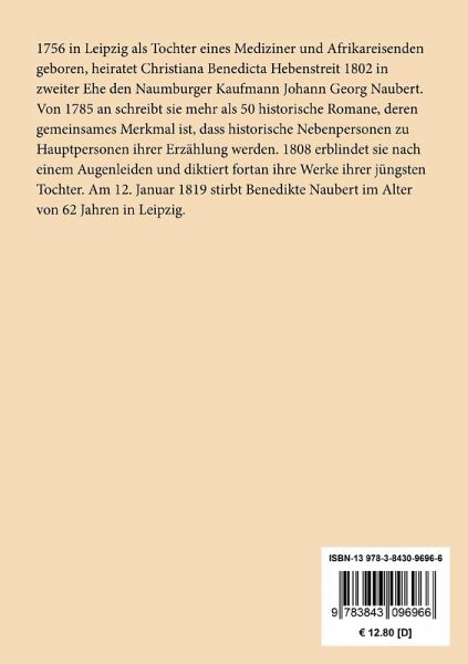 1756 in Leipzig als Tochter eines Mediziner und Afrikareisenden geboren, heiratet Christiana Benedicta Hebenstreit 1802 in zweiter Ehe den Naumburger Kaufmann Johann Georg Naubert. Von 1785 an schreibt sie mehr als 50 historische Romane, deren gemeinsames Merkmal ist, dass historische Nebenpersonen zu Hauptpersonen ihrer Erzählung werden. 1808 erblindet sie nach einem Augenleiden und diktiert fortan ihre Werke ihrer jüngsten Tochter. Am 12. Januar 1819 stirbt Benedikte Naubert im Alter von 62 Jahren in Leipzig.