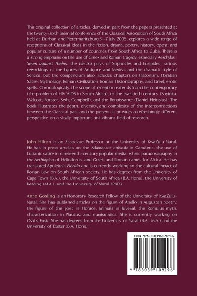 The Editors: John Hilton is an Associate Professor at the University of KwaZulu-Natal. He has in press articles on the Adamastor episode in Camõens, the use of Lucianic satire in nineteenth-century popular media, ethnic paradoxography in the Aethiopica of Heliodorus, and Greek and Roman names for Africa. He has translated Apuleius¿s Florida and is currently working on the cultural impact of Roman Law on South African society. He has degrees from the University of Cape Town (B.A.), the University of South Africa (B.A. Hons), the University of Reading (M.A.), and the University of Natal (Ph.D.). Anne Gosling is an Honorary Research Fellow of the University of KwaZulu-Natal. She has published articles on the figure of Apollo in Augustan poetry, the figure of the poet in Horace, animals in Juvenal, the Romulus myth, characterization in Plautus, and numismatics. She is currently working on Ovid¿s Fasti. She has degrees from the University of Natal (B.A., M.A.) and the University of Exeter (B.A. Hons).