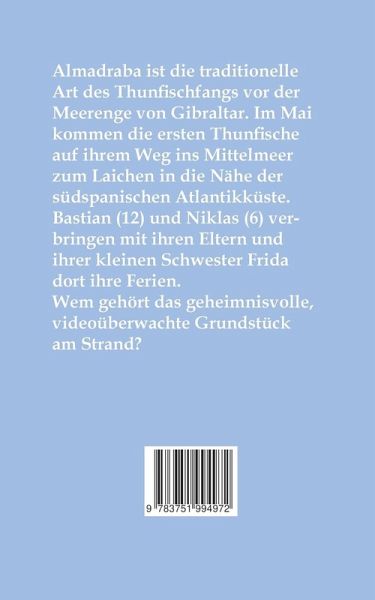 Almadraba ist die traditionelle Art des Thunfischfangs vor der Meerenge von Gibraltar. Im Mai kommen die ersten Thunfische auf ihrem Weg ins Mittelmeer zum Laichen in die Nähe der südspanischen Atlantikküste.Bastian (12) und Niklas (6) verbringen mit ihren Eltern und ihrer kleinen Schwester Frida dort ihre Ferien. Wem gehört das geheimnisvolle, videoüberwachte Grundstück am Strand?