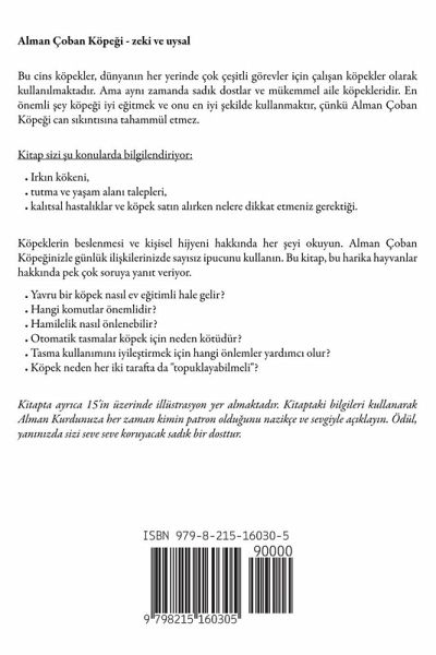 Alman Çoban Köpe¿i - zeki ve uysal Bu cins köpekler, dünyan¿n her yerinde çok çe¿itli görevler için çal¿¿an köpekler olarak kullan¿lmaktad¿r. Ama ayn¿ zamanda sad¿k dostlar ve mükemmel aile köpekleridir. En önemli ¿ey köpe¿i iyi e¿itmek ve onu en iyi ¿ekilde kullanmakt¿r, çünkü Alman Çoban Köpe¿i can s¿k¿nt¿s¿na tahammül etmez. Kitap sizi ¿u konularda bilgilendiriyor:Irk¿n kökeni, tutma ve yäam alan¿ talepleri, kal¿tsal hastal¿klar ve köpek sat¿n al¿rken nelere dikkat etmeniz gerekti¿i. Köpeklerin beslenmesi ve ki¿isel hijyeni hakk¿nda her ¿eyi okuyun. Alman Çoban Köpe¿inizle günlük ili¿kilerinizde say¿s¿z ipucunu kullan¿n. Bu kitap, bu harika hayvanlar hakk¿nda pek çok soruya yan¿t veriyor.Yavru bir köpek nas¿l ev e¿itimli hale gelir? Hangi komutlar önemlidir? Hamilelik nas¿l önlenebilir? Otomatik tasmalar köpek için neden kötüdür? Tasma kullan¿m¿n¿ iyile¿tirmek için hangi önlemler yard¿mc¿ olur? Köpek neden her iki tarafta da "topuklayabilmeli"? Kitapta ayr¿ca 15'in üzerinde illüstrasyon yer almaktad¿r. Kitaptaki bilgileri kullanarak Alman Kurdunuza her zaman kimin patron oldu¿unu nazikçe ve sevgiyle aç¿klay¿n. Ödül, yan¿n¿zda sizi seve seve koruyacak sad¿k bir dosttur.