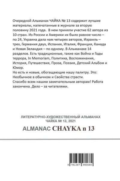 The Anthology "Seagull" Vol. 13, 2021 (Almanac Chayka) includes selected stories, articles, assays, and poems by over 62 authors from 10 countries: USA, Russia, Ukraine, Germany, France, Canada. Italy, Israel, Spain, New Zealand. It gathers the best materials published in the online magazine Chayka (Seagull Magazine) between July 2021 and December2021. Editor: Irina Chaykovskaya