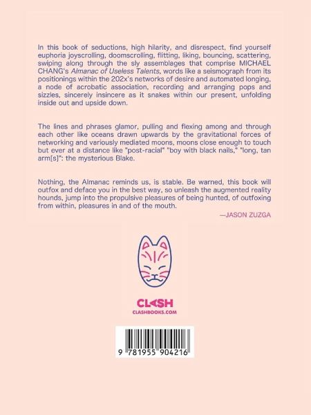 Fence poetry editor and rising star Michael Chang's Almanac of Useless Talents is a must-read for poetry lovers and newbies alike. This is a useless Almanac. There’s no seasonal data, only poems good for leaving the club in haute couture with mid-level poets, for ambiguous sex, mouthy seductions, shoulder-turns of cold cock disrespect.Part confessional, part experimental, and completely original, Chang is a poet read in classrooms and on phone screens with equal fervor. Each poem deftly deforms self into outrageous performance. This poetry snaps and twists so fast you’ll miss things: the intricate formal craft, the bitchy wordplay. A dopamine rush delving into desire’s throbbing networks of flesh and circuit, identity, relationships, Aznness, queerdom, and more that would arouse Ashbery envy, Chang’s playful style is edgy, surprising, and delightful. In Chang’s world, sentiment is déeacute;cor: come face the amusing ever-ache of our desires or go ahead and try to outrun them.