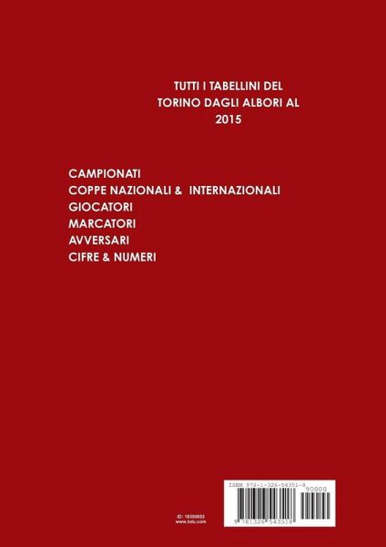 Tutti i tabellini del Torino anno per anno, dal 1894 al 2015 compreso: squadre avversari, risultati, giocatori, marcatori, giocatori sostituiti, giocatori subentrati, stagione per stagione, oltre 100 tabellini di facile consultazione. #FVCG. #SFT libri torino calcio. ISBN 9781326543518. ISBN 978-1-326-54351-8. ISBN #SFT, ISBN TORINO.
