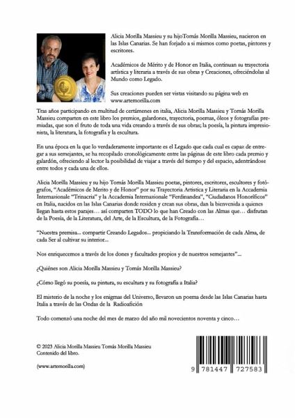 Tras años participando en multitud de certámenes en italia, Alicia Morilla Massieu y Tomás Morilla Massieu comparten en este libro los premios, galardones, trayectoria, poemas, óleos y fotografías premiadas, que son el fruto de toda una vida creando a través de sus obras; la poesía, la pintura impresionista, la literatura, la fotografía y la escultura. En una época en la que lo verdaderamente importante es el Legado que cada cual es capaz de entregar a sus semejantes, se ha recopilado cronológicamente entre las páginas de este libro cada premio y galardón, ofreciendo al lector la posibilidad de viajar a través del tiempo y del espacio, adentrándose entre todos y cada una de ellos. Alicia Morilla Massieu y su hijo Tomás Morilla Massieu poetas, pintores, escritores, escultores y fotógrafos, "Académicos de Merito y de Honor" por su Trayectoria Artistica y Literaria en la Accademia Internazionale "Trinacria" y la Accademia Internazionale "Ferdinandea", "Ciudadanos Honoríficos" en Italia, nacidos en las Islas Canarias donde residen y crean sus obras, dan la bienvenida a quienes llegan hasta estos parajes... así comparten TODO lo que han Creado con las Almas que... disfrutan de la Poesía, de la Literatura, del Arte, de la Escultura, de la Fotografía... "Nuestra premisa... compartir Creando Legados... propiciando la Transformación de cada Alma, de cada Ser al cultivar su interior... Nos enriquecemos a través de los dones y facultades propios y de nuestros semejantes"... ¿Quiénes son Alicia Morilla Massieu y Tomás Morilla Massieu? ¿Cómo llegó su poesía, su pintura, su escultura y su fotografía a Italia? El misterio de la noche y los enigmas del Universo, llevaron un poema desde las Islas Canarias hasta Italia a través de las Ondas de la Radioafición Todo comenzó una noche del mes de marzo del año mil novecientos noventa y cinco...