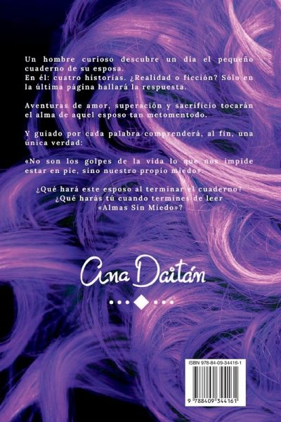 Un hombre curioso descubre un día el pequeño cuaderno de su esposa. En él: cuatro historias. ¿Realidad o ficción? Sólo en la última página hallará la respuesta: -En nuestra primera historia descubrirá a una mujer que perdió todo... hasta ella misma. Eterno personaje secundario y jamás la protagonista de su propia vida. ¿Un viejo loco le ayudará a encontrar la salida? -En la segunda, un joven fotógrafo se enfrentará a sus fantasmas para cuidar del Diablo que lo desprecia. ¿Las lecciones del Ángel de su pasado lograrán salvarlo o caerá en el Infierno? ¿Es posible ver la luz para un ciego? -En la tercera historia una violinista española y un actor japonés se enfrentarán al odio, al desprecio y a la locura en plena dictadura argentina. ¿Logrará su amor superar a la tortura? -Y en nuestra última historia el valor se hace persona a través de una anciana cobarde que se enfrenta a terroristas. ¿Podrá el amor de una abuela derrotar al Isis? Aventuras de amor, superación y sacrificio tocarán el alma de aquel esposo tan metomentodo. Y guiado por cada palabra comprenderá, al fin, una única verdad: No son los golpes de la vida lo que nos impide estar en pie, sino nuestro propio miedo. ¿Qué hará este esposo al terminar el cuaderno? ¿Qué harás tú cuando termines de leer Almas Sin Miedo? Una novela cuyo formato papel y en español se intentó censurar para España, Reino Unido, Italia, Canadá y Australia por una de las compañías más grandes del mundo que mantiene la censura encubierta de la novela ocultando de los motores de búsqueda su página de venta en la misma. Más información próximamente en www.anadaitan.com.