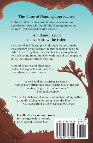 The Nezel are refugee servants, toiling in a desert land where their culture is barely tolerated. Two friends, prowling through secret tunnels, uncover a villainous plot that places the Nezel in jeopardy. Almond and Quartz hatch a desperate plan to aid Finch, rightful heir to the throne. Even with the help of unexpected allies, their heroic efforts may not be enough-and the Time of Naming cannot be delayed. All adolescents must choose a gender and a new name for adulthood but Almond, intensely private, struggles to make this choice. Almond, Quartz, and Finch strive to claim their true selves and protect their people in perilous times.