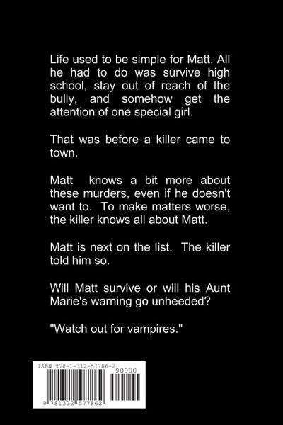 Life used to be simple for Matt. All he had to do was survive high school, stay away from the bully, and somehow get the attention of one specfial girl. That has all changed. A killer has come to town and Matt seems to know a bit more than he should. Will Matt survive the killer or will Aunt Marie's warning go unheard? "Watch out for vampires."