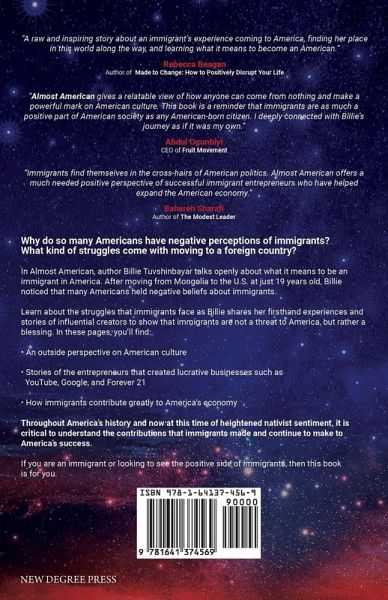 Why do so many Americans have negative perceptions of immigrants? What kind of struggles come with moving to a foreign country? In Almost American, author Billie Tuvshinbayar talks openly about what it means to be an immigrant in America. After moving from Mongolia to the U.S. at just 19 years old, Billie noticed that many Americans held negative beliefs about immigrants. Learn about the struggles that immigrants face as Billie shares her firsthand experiences and stories of influential creators to show that immigrants are not a threat to America, but rather a blessing. In these pages, you'll find: * An outside perspective on American culture * Stories of the entrepreneurs that created lucrative businesses such as YouTube, Google, and Forever 21 * How immigrants contribute greatly to America's economy Throughout America's history and now at this time of heightened nativist sentiment, it is critical to understand the contributions that immigrants made and continue to make to America's success. If you are an immigrant or looking to see the positive side of immigrants, then this book is for you.