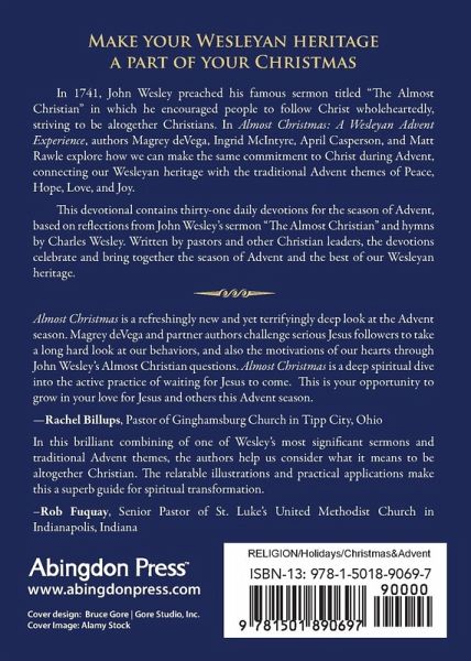 In 1741, John Wesley preached his famous sermon titled "The Almost Christian" in which he encouraged people to follow Christ wholeheartedly. We should not be satisfied with being almost Christian but rather strive towards being altogether a Christian. In Almost Christmas: A Wesleyan Advent Experience, author and pastor Magrey deVega leads a group of authors to explore how we can make the same commitment to Christ during Advent, connecting our Wesleyan heritage with the traditional Advent themes of Love, Hope, Joy, and Peace. In this book, perfect for Advent, deVega and the other authors break down the barriers that prevent us from experiencing an "altogether" love, hope, joy, and peace in Christ in our lives and in the world around us. They demonstrate the promises God offers to us that makes those longings a reality, inviting us to claim those promises for ourselves this Advent and celebrate an altogether Christmas. The devotional contains 28 daily devotions for the four weeks of Advent corresponding to the themes of Altogether Love, Altogether Hope, Altogether Joy, and Altogether Peace. Written by pastors and other leaders, the devotions celebrate and bring together the season of Advent and the best of our Wesleyan heritage.