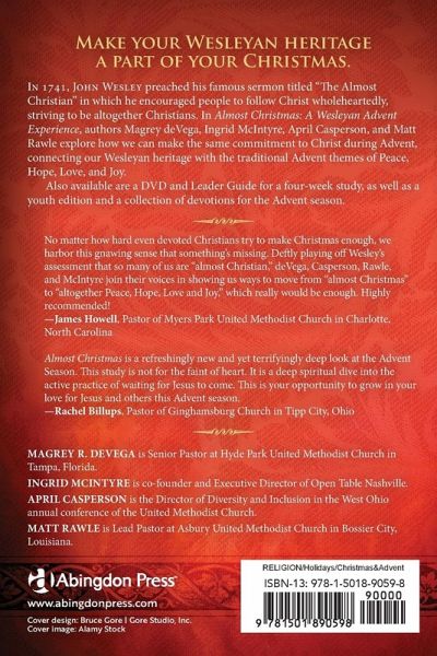 In 1741, John Wesley preached his famous sermon titled "The Almost Christian" in which he encouraged people to follow Christ wholeheartedly. We should not be satisfied with being almost Christian but rather strive towards being altogether a Christian. In Almost Christmas: A Wesleyan Advent Experience, author and pastor Magrey deVega leads a group of authors to explore how we can make the same commitment to Christ during Advent, connecting our Wesleyan heritage with the traditional Advent themes of Love, Hope, Joy, and Peace. In this book, perfect for Advent, deVega and the other authors break down the barriers that prevent us from experiencing an "altogether" love, hope, joy, and peace in Christ in our lives and in the world around us. They demonstrate the promises God offers to us that makes those longings a reality, inviting us to claim those promises for ourselves this Advent and celebrate an altogether Christmas. Chapters include: Altogether Love Altogether Hope Altogether Joy Altogether Peace Additional components for a four-week study include a DVD featuring Magrey deVega and the other writers and a comprehensive Leader Guide, as well as nativity hymns by Charles Wesley, litanies for lighting the Advent wreath, and prayers that can be incorporated into both worship and small group settings. A daily devotional and a youth study book are also available.