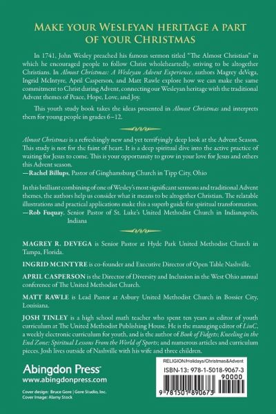 In 1741, John Wesley preached his famous sermon titled "The Almost Christian" in which he encouraged people to follow Christ wholeheartedly. We should not be satisfied with being almost Christian but rather strive towards being altogether a Christian. In Almost Christmas: A Wesleyan Advent Experience, author and pastor Magrey deVega leads a group of authors to explore how we can make the same commitment to Christ during Advent, connecting our Wesleyan heritage with the traditional Advent themes of Love, Hope, Joy, and Peace. In this book, perfect for Advent, deVega and the other authors break down the barriers that prevent us from experiencing an "altogether" love, hope, joy, and peace in Christ in our lives and in the world around us. They demonstrate the promises God offers to us that makes those longings a reality, inviting us to claim those promises for ourselves this Advent and celebrate an altogether Christmas. This Youth Study Book takes the ideas presented in the book and interprets them for young people grades 6-12.