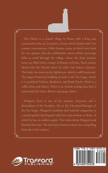 Port Haven is a coastal village in Maine with a long past connected to the sea. It retains a charm which blends with 21st century conveniences. Older homes, many of which were built for sea captains, line the cobblestone streets which encourage folks to stroll through the village, where the shop window boxes are filled with a variety of flowers or herbs. Their aromas blend with the blissful odors of coffee and bakery fantasies. This leads one down to the lighthouse, which is still functional. The largest historical building in town is the Sea Scape, which is a combined Library, Bookstore and Book Nook, which is a coffee shop and bakery. There is an outside seating area that is surrounded by herbs, flowers and grape arbors. Margaret Scott is one of the primary characters and a descendant of the founders. She is the Librarian/Manager of the Sea Scape. Margaret's assistant and beloved companion is a mixed golden lab/sheperd with love and wisdom to share, of which he has an endless supply. This is also where Margaret and Richard first met. The chemistry between them was compelling from their first contact.