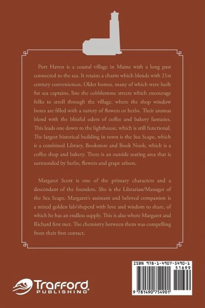 Port Haven is a coastal village in Maine with a long past connected to the sea. It retains a charm which blends with 21st century conveniences. Older homes, many of which were built for sea captains, line the cobblestone streets which encourage folks to stroll through the village, where the shop window boxes are filled with a variety of flowers or herbs. Their aromas blend with the blissful odors of coffee and bakery fantasies. This leads one down to the lighthouse, which is still functional. The largest historical building in town is the Sea Scape, which is a combined Library, Bookstore and Book Nook, which is a coffee shop and bakery. There is an outside seating area that is surrounded by herbs, flowers and grape arbors. Margaret Scott is one of the primary characters and a descendant of the founders. She is the Librarian/Manager of the Sea Scape. Margaret's assistant and beloved companion is a mixed golden lab/sheperd with love and wisdom to share, of which he has an endless supply. This is also where Margaret and Richard first met. The chemistry between them was compelling from their first contact.