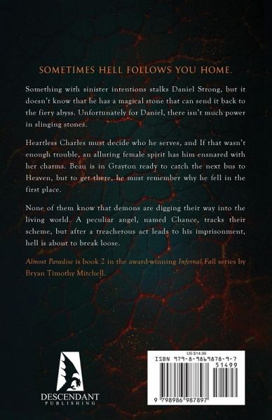 Sometimes Hell follows you home. Something with sinister intentions stalks Daniel Strong, but it doesn't know that he has a magical stone that can send it back to the fiery abyss. Unfortunately for Daniel, there isn't much power in slinging stones. Heartless Charles must decide who he serves, and If that wasn't enough trouble, an alluring female spirit has him ensnared with her charms. Beau is in Grayton ready to catch the next bus to Heaven, but to get there, he must remember why he fell in the first place. None of them know that demons are digging their way into the living world. A peculiar angel, named Chance, tracks their scheme, but after a treacherous act leads to his imprisonment, hell is about to break loose. Almost Paradise is book 2 in the Infernal Fall series by Bryan Mitchell.