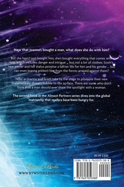 Looking for a powerful female protagonist? Look no further... Now that Joanna's bought a man, what does she do with him? But she hasn't just bought him; she's bought everything that comes with him, which includes danger and intrigue ... but not a lot of clothes. Scott's new owner and her status promise a better life for him and his gender ... but can even Joanna protect him from the forces arrayed against them? Now, as Joanna and Scott take to the stage to promote their new documentary, threats bubble to the surface. There are some who don't think that a man should ever share the spotlight with a woman. The second book in the Almost Partners series dives into the global matriarchy that readers have been hungry for.