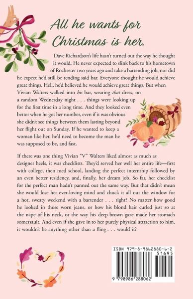 All he wants for Christmas is her. ¿¿Dave Richardson's life hasn't turned out the way he thought it would. He never expected to slink back to his hometown of Rochester two years ago and take a bartending job, nor did he expect he'd still be tending said bar. Everyone thought he would achieve great things. Hell, he'd believed he would achieve great things. But when Vivian Walters walked into his bar, wearing that dress, on a random Wednesday night . . . things were looking up for the first time in a long time. And they looked even better when he got her number, even if it was obvious she didn't see things between them lasting beyond her night out on Sunday. If he wanted to keep a woman like her, he'd need to become the man he was supposed to be, and fast. If there was one thing Vivian "V" Walters liked almost as much as designer heels, it was checklists. They'd served her well her entire life- first with college, then med school, landing the perfect internship followed by an even better residency, and, finally, her dream job. So far, her checklist for the perfect man hadn't panned out the same way. But that didn't mean she would lose her ever-loving mind and chuck it all out the window for a hot, sweaty weekend with a bartender . . . right? No matter how good he looked in those worn jeans, or how his blond hair curled just so at the nape of his neck, or the way his deep-brown gaze made her stomach somersault. And even if she gave in to her purely physical attraction to him, it wouldn't be anything other than a fling . . . would it?