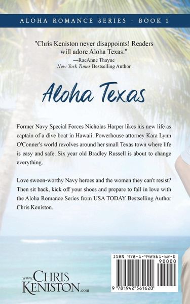 Former Navy Special Forces Nicholas Harper likes his new life as captain of a dive boat in Hawaii. Powerhouse attorney Kara Lynn O'Conner's world revolves around her small Texas town where life is easy and safe. Six year old Bradley Russell is about to change everything. "This warmhearted read will draw readers in and keep them flipping to the last romantic page." Nancy Naigle, USA TODAY Bestselling Author. Love Page Turning Romance? Books you can share with friends and family? Swoon-worthy Navy heroes and the women they can't resist? Then sit back, kick off your shoes and prepare to fall in love with the Aloha Romance Series from USA TODAY Bestselling Author Chris Keniston. MORE IN THE SERIES: Aloha Texas: Beach Read Edition Almost Paradise: Beach Read Edition Mai Tai Marriage : Beach Read Edition Dive into You : Beach Read Edition Look of Love: Beach Read Edition Love by Design: Beach Read Edition Love Walks In: Beach Read Edition Shell Game : Beach Read Edition Flirting with Paradise