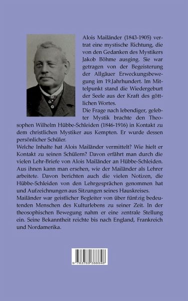 Alois Mailänder (1843-1905) war in der Zeit von 1885 bis 1900 ein geistlicher Wegbegleiter des Theosophen Wilhelm Hübbe-Schleiden (1846-1916), dem Präsidenten der Theosophischen Gesellschaft in Deutschland. Mitglieder dieser Gesellschaft interessierten sich für Mystik, Spiritismus und die damals neu entdeckte indische Religion. Die Frage nach lebendiger, gelebter Mystik brachte die beiden in einen Kontakt zueinander und führte zu einer langjährigen Schülerschaft Hübbe-Schleidens. Welche Inhalte hat Mailänder vermittelt? Wie hielt er Kontakt zu seinen Schülern? Davon erfährt man durch die erhaltenen Lehr-Briefe, aus denen man entnehmen kann, wie der christliche Mystiker seine Schüler unterwies. Aufschlussreich sind auch die vielen Notizen, die sich Hübbe-Schleiden von den Lehrgesprächen seines Lehrers gemacht hat und die Aufzeichnungen aus Sitzungen seines Hauskreises.
