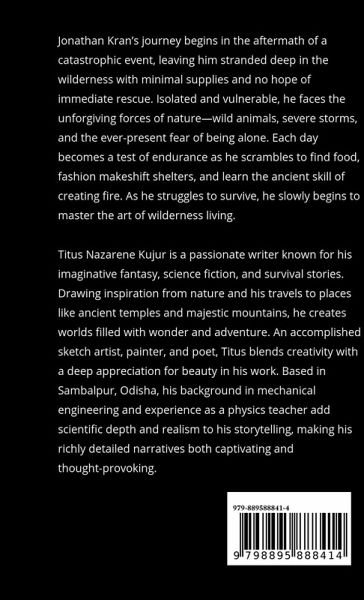Here's a refined version of the survival story: Jonathan Kran's journey begins in the aftermath of a catastrophic event, leaving him stranded deep in the wilderness with minimal supplies and no hope of immediate rescue. Isolated and vulnerable, he faces the unforgiving forces of nature-wild animals, severe storms, and the ever-present fear of being alone. Each day becomes a test of endurance as he scrambles to find food, fashion makeshift shelters, and learn the ancient skill of creating fire. As he struggles to survive, he slowly begins to master the art of wilderness living. Jonathan endures physical injuries and battles the weight of loneliness, but his determination never wavers. With every hardship, he gains crucial survival knowledge-learning to hunt, craft tools from his surroundings, and navigate the landscape by the stars. His bond with the land strengthens, and over time, he discovers how to exist in harmony with the natural world. As the seasons pass, Jonathan builds a permanent shelter, relying on the wilderness for food, materials, and medicinal plants. What began as a desperate fight for survival transforms into a life of self-reliance and peace. The once-threatening wilderness becomes his home, reshaping him from a lost man into someone profoundly connected to the earth, confident in his ability to thrive alone.
