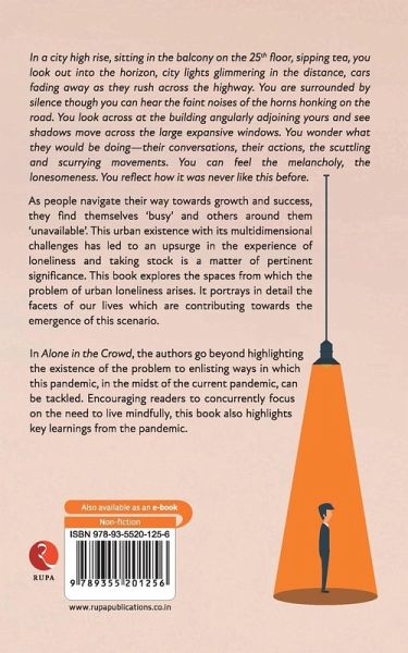 In a city high-rise, sitting in the balcony on the 25th floor, sipping tea, you look out into the horizon, city lights glimmering in the distance, cars fading away as they rush across the highway. You are surrounded by silence though you can hear the faint noises of the horns honking on the road. You look across at the building angularly adjoining yours and see shadows move across the large expansive windows. You wonder what they would be doing-their conversations, their actions, the scuttling and scurrying movements. You can feel the melancholy, the lonesomeness. You reflect how it was never like this before. As people navigate their way towards growth and success, they find themselves 'busy' and others around them 'unavailable'. This urban existence with its multidimensional challenges has led to an upsurge in the experience of loneliness and taking stock is a matter of pertinent significance. This book explores the spaces from which the problem of urban loneliness arises. It portrays in detail the facets of our lives which are contributing towards the emergence of this scenario. In Alone in the Crowd, the authors go beyond highlighting the existence of the problem to enlisting ways in which this pandemic, in the midst of the current pandemic, can be tackled. Encouraging readers to concurrently focus on the need to live mindfully, this book also highlights key learnings from the pandemic.