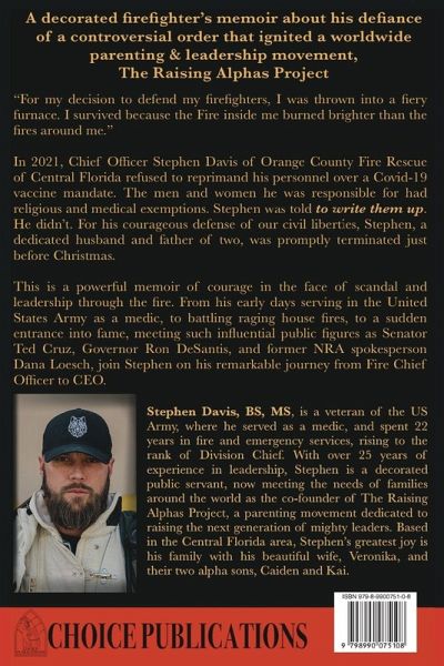 A decorated firefighter's memoir about his defiance of a controversial order that ignited a worldwide parenting and leadership movement, The Raising Alphas Project. "For my decision to defend my firefighters, I was thrown into a fiery furnace. I survived because the Fire inside me burned brighter than the fires around me." In 2021, Chief Officer Stephen Davis of Orange County Fire Rescue of Central Florida refused to reprimand his personnel over a Covid-19 vaccine mandate. The men and women he was responsible for had religious and medical exemptions - Stephen was told to write them up. He didn't. For his courageous defense of our civil liberties, Stephen, a dedicated husband and father of two was promptly terminated just before Christmas. This is a powerful memoir of courage in the face of scandal and leadership through the fire. From his early days serving in the United States Army as a medic, to battling raging house fires, to a sudden entrance into fame, meeting such influential public figures as Senator Ted Cruz, Governor Ron DeSantis, and former NRA spokesperson Dana Loesch, join Stephen on his remarkable journey from Fire Chief Officer to CEO. Choice Publications is proud to present this book for anyone who wants to become a greater leader; anyone who wants to raise their children to be strong and courageous, prepared to fight the fires of life. If you care about speaking up for what's right, then you need to read this book today!