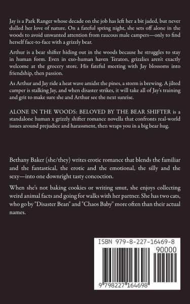 Jay is a Park Ranger whose decade on the job has left her a bit jaded, but never dulled her love of nature. On a fateful spring night, she sets off alone in the woods to avoid unwanted attention from raucous male campers-only to find herself face-to-face with a grizzly bear. Arthur is a bear shifter hiding out in the woods because he struggles to stay in human form. Even in exo-human haven Teraton, grizzlies aren't exactly welcome at the grocery store. His fateful meeting with Jay blossoms into friendship, then passion. As Arthur and Jay ride a heat wave amidst the pines, a storm is brewing. A jilted camper is stalking Jay, and when disaster strikes, it will take all of Jay's training and grit to make sure she and Arthur see the next sunrise. ALONE IN THE WOODS: BELOVED BY THE BEAR SHIFTER is a standalone human x grizzly shifter romance novella (32k words, 140 pgs) in the Modern Monsters: Sugar & Spice series that confronts real-world issues around prejudice and harassment, then wraps you in a big bear hug.