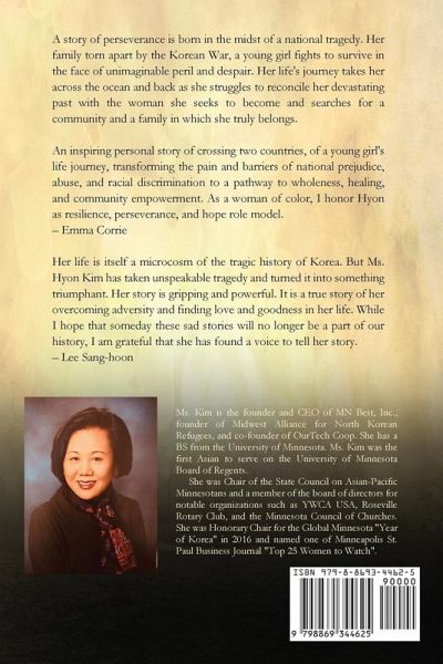 A story of perseverance is born in the midst of a national tragedy. Her family torn apart by the Korean War, a young girl fights to survive in the face of unimaginable peril and despair. Her life's journey takes her across the ocean and back as she struggles to reconcile her devastating past with the woman she seeks to become and searches for a community and a family in which she truly belongs.