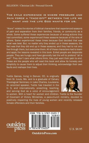 The exile experience is where pressure and pain force a "face-off" between the life we want and the life God wants for us. "Alone" relates the stories of biblical characters that experienced seasons of pain and separation from their families, friends, or community as a whole. Some suffered these experiences because of wrong actions they had committed, some experienced these seasons because of the sins of others. Some experienced these times because God decided that was what was best. But, no matter why they ended up in these seasons, the fact was that they did end up in these seasons; and they had to not only live through them, but overcome them. All of these characters had to learn and apply the lessons revealed in this book. Exiled people are desperate people. They are hungry and have generally lost the will to pretend "all is well". They don't care what others think, they just want their pain to end. These are the people who will read this book and allow its honesty and simplicity to cause them to adjust their thinking, acknowledge their own faults and reshape their lives.
