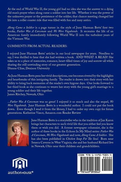 At the end of World War II, the young girl had no idea she was the answer to a dying old man's prayer when along came a soldier into her life. Whether it was the power of the unknown prayer or the persistence of the soldier, that chance meeting changed her life into a roller coaster ride that was filled with fun and zany antics. Along Came a Soldier is a page turner in the style of June Harman Betts' first two books, Father Was A Caveman and We Were Vagabonds. It recreates the life of an American family immediately following World War II into the turbulent years of the Vietnam War. COMMENTS FROM ACTUAL READERS: I enjoyed June Harman Betts' articles in our local paper for years. Needless to say, I was thrilled to hear that she had written a book. AND WHAT A READ! ...As she did so well in her newspaper articles, she takes us to a place of memories, romance, heart-filled times of joy and sorrow-all while sharing the still unwinding story of our greatest generation. Dianne Cline, Denison University ~~~~~~~~~~~~~~~~~~~~~~~~~~~~~~~~~~~~~~~~ As June Harman Betts pens the true story of the family's history, one becomes riveted by the highlights and heartbreaks of this intriguing family. The reader is drawn into the family's history with her ability to bring back memories of the reader's own bygone days through her vivid description of the various areas of the country where the family lived. One looks forward to her third book as she continues to weave her story with the young girl's marriage to a young soldier and their life together. James Ritchey, Newark, Ohio ...Father Was A Caveman was so great, especially when it described days of long ago. I enjoyed it so much and also the sequel, We Were Vagabonds. June Harman Betts is a wonderful author. I could not put the book down. Even though I read it from the library in Petersburg, West Virginia, I had to order my own copy for future generations. Katherine Vance, Amazon.com Reader Review.