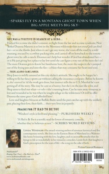 Sparks fly in a Montana ghost town when Big Apple meets Big Sky in this Christian romance. Framed for a crime she didn't commit, fleeing from the law and a crime syndicate, New Yorker Deanna Manetti is so lost in the Montana wilderness that not even God can find her-or so she thinks. Just when it can't get any worse, she's run off the road by a wild mustang, rescued by a cowboy packing iron, and carried off on horseback to the remote ghost town he calls a ranch. Deanna can't help but wonder if God has abandoned her-or is He just giving her a place to lay low until she can figure a way out of the mess she's in? The more Deanna gets to know her handsome host, the more she suspects she's jumped out of the frying pan and into the fire-a blaze that may consume her heart and soul. Then, along came Jones. Shep Jones is mildly amused at this city slicker's attitude. She ought to be happy he's willing to fix her fancy sports car without calling the insurance company. Before he knows it, she's moved in 'til the work gets done, but instinct tells the ex-U.S. Marshal he's not getting all of the story. Shep aims to find out what-or who-she's running from. Can he turn away someone as lost and wonded as he was when he sought refuge in the wilderness? Or will he offer Deanna the same grace God afforded him? Love and laughter blossom at Buffalo Butte until the past catches up with the unlikely pair, placing their love, their faith, and their lives in jeopardy.