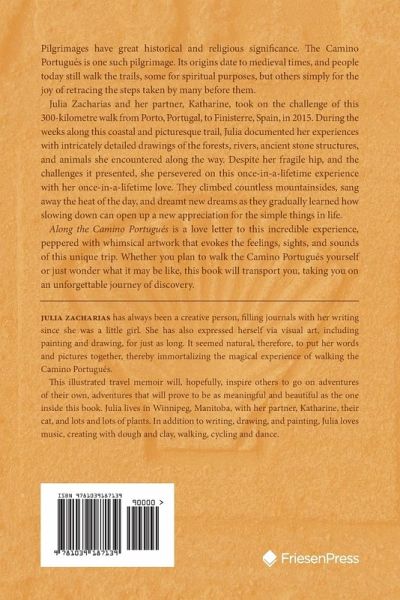 Pilgrimages have great historical and religious significance. The Camino Portugués is one such pilgrimage. Its origins date to medieval times, and people today still walk the trails, some for spiritual purposes, but others simply for the joy of retracing the steps taken by many before them. Julia Zacharias and her partner, Katharine, took on the challenge of this 300-kilometre walk from Porto, Portugal, to Finisterre, Spain, in 2015. During the weeks along this coastal and picturesque trail, Julia documented her experiences with intricately detailed drawings of the forests, rivers, ancient stone structures, and animals she encountered along the way. Despite her fragile hip, and the challenges it presented, she persevered on this once-in-a-lifetime experience with her once-in-a-lifetime love. They climbed countless mountainsides, sang away the heat of the day, and dreamt new dreams as they gradually learned how slowing down can open up a new appreciation for the simple things in life. Along the Camino Portugués is a love letter to this incredible experience, peppered with whimsical artwork that evokes the feelings, sights, and sounds of this unique trip. Whether you plan to walk the Camino Portugués yourself or just wonder what it may be like, this book will transport you, taking you on an unforgettable journey of discovery.