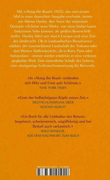 Mit «Along the Road» lernen wir Aldous Huxley, den Autor der visionären Dystopie «Schöne neue Welt», von einer bisher kaum bekannten Seite kennen: als großen Reiseschriftsteller. Huxley führt uns durch das Europa der Zwanziger, eine Welt im Umbruch, in der eine neue Mobilität auf alte Formen des Reisens prallt. Auch Huxley erliegt dem Reiz der Geschwindigkeit, wenn er mit seinem 10-PS-Citroën in Oberitalien an kunstbeflissenen deutschen Wandervögeln vorbeirauscht. Zugleich folgen wir einem humorvollen Flaneur, der im Zugabteil dritter Klasse den Geschichten der Menschen lauscht, sich mit großer Lust am Unerwarteten am liebsten von völlig veralteten Reiseführern durch Amsterdam, Paris oder Rom leiten lässt und einfach eine grün getönte Brille aufsetzt, wenn es den Weiten Südfrankreichs mal etwas an Frische fehlt. Er sucht nach verborgenen Kulturschätzen, ist auf den Spuren Bruegels oder Botticellis, in Konzerten oder Theatern, beim Pferderennen in Siena und an den Küsten Italiens. Und zwischen Elba, lombardischen Renaissancestädten und der traumschönen Landschaft der Toskana entdeckt er eine verloren geglaubte Welt.