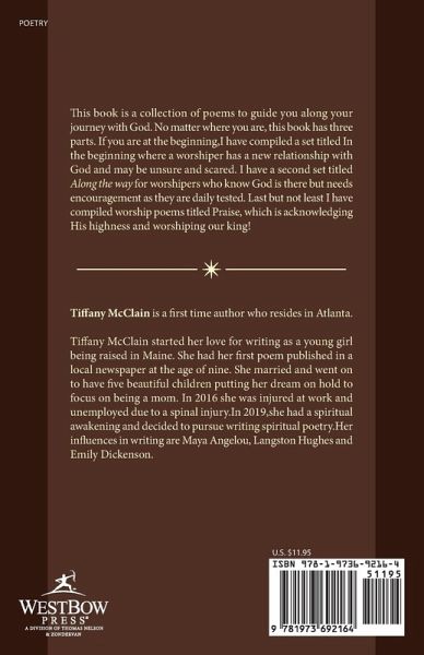 This book is a collection of poems to guide you along your journey with God. No matter where you are, this book has three parts. If you are at the beginning,I have compiled a set titled In the beginning where a worshiper has a new relationship with God and may be unsure and scared. I have a second set titled Along the way for worshipers who know God is there but needs encouragement as they are daily tested. Last but not least I have compiled worship poems titled Praise, which is acknowledging His highness and worshiping our king!