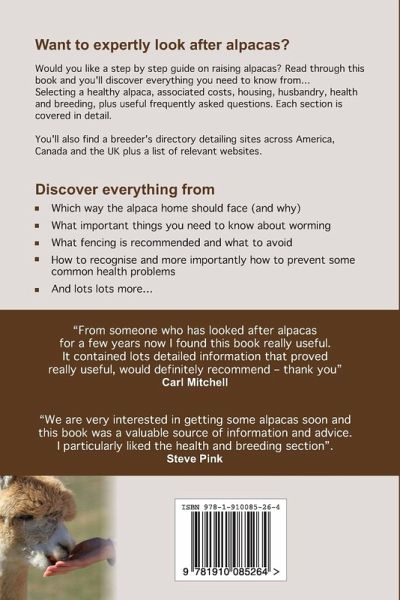 Want to expertly look after alpacas? Would you like a step by step guide on raising alpacas? Read through this book and you'll discover everything you need to know from... Selecting a healthy alpaca, associated costs, housing, husbandry, health and breeding, plus useful frequently asked questions. Each section is covered in detail. You'll also find a breeder's directory detailing sites across America, Canada and the UK plus a list of relevant websites. Discover everything from Which way the alpaca home should face (and why) What important things you need to know about worming What fencing is recommended and what to avoid How to recognise and more importantly how to prevent some common health problems And lots lots more...