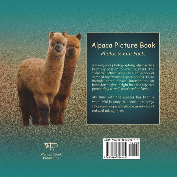 The "Alpaca Picture Book: Photos & Fun Facts" is a collection of some of my favorite alpaca pictures. My photos span over 13 years of raising and breeding alpacas. Through my photography, this picture book is a fun and easy way to learn about alpacas. I also include some information on their behavior to give insight into the alpaca's personality as well as other fun facts. My time with these precious animals has been a wonderful journey that continues today. I hope you enjoy my photos as much as I enjoyed taking them. Sections in the book: Meeting the Alpaca - pictures with basic information Behavior - photographs that show off their unique personality Grazing - what they eat and don't eat Crias - special baby alpaca pictures Fiber - information on their fiber and colorful fleece pics Fun Photos - my favorite funny alpaca pictures Tails End - end of book photos