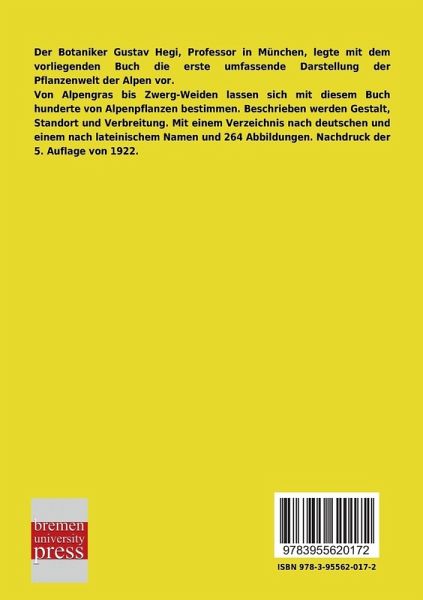 Von Alpengras bis Zwerg-Weiden lassen sich mit diesem Buch hunderte von Alpenpflanzen bestimmen. Beschrieben werden Gestalt, Standort und Verbreitung. Mit einem Verzeichnis nach deutschen und einem nach lateinischem Namen und 264 Abbildungen. Nachdruck der 5. Auflage von 1922.