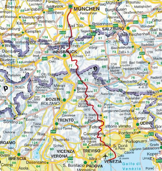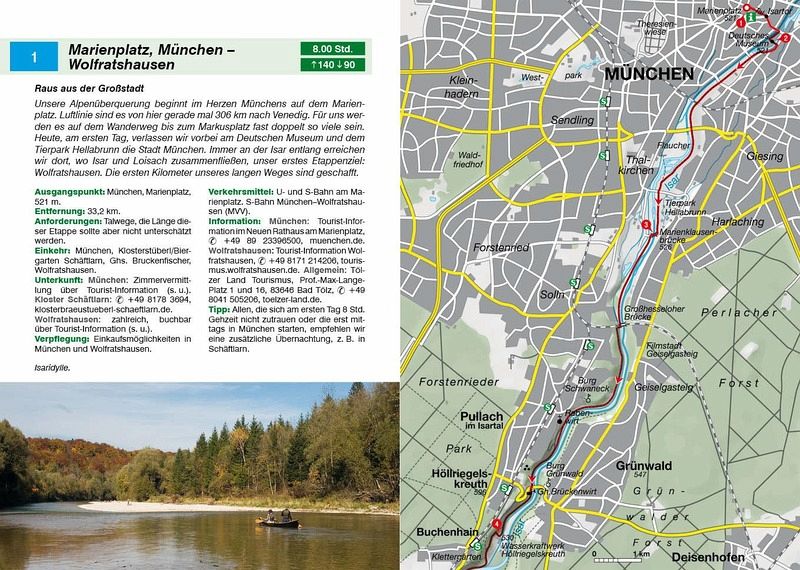 Die berühmte Alpenüberquerung beginntim Herzen von München und folgt der Isar bis in die Berge. Ein Höhepunkt ist die Überschreitung des Alpenhauptkamms zwischen den vergletscherten Gipfeln der Zillertaler Alpen. Danach warten die majestätischen Dolomiten mit ihren spektakulären Felsformationen. Auf den letzten Kilometern wird mit die wilde Schiara mit einem anspruchsvollen Klettersteig bezwungen, bevor der Weg sanft zur venezianischen Ebene hin gemütlich ausläuft. Nach 555 Kilometern und mehr als 22.000 Höhenmetern liegt das Ziel schließlich vor den Wanderern: Venedig! Wer es bis zum Markusplatz schafft, hat nicht nur eine körperliche Herausforderung gemeistert, sondern auch unzählige unvergessliche Momente gesammelt.