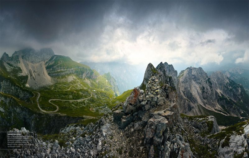 Die Fotos in diesem großformatigen Bildband sind definitiv eine Wucht. Sicher sind auch einige wenige 'Postkartenmotive' dabei. Soll heißen Fotos von dem einen oder anderen Gipfel, von dem einen oder anderen Gebirgstal wie man sie so oder ähnlich von den Postkarten kennt. Aber die meisten Bilder sind vom Motiv nicht nur neu, sondern sie vermitteln einen sehr realistischen Eindruck von den Stimmungen, die sich in den Alpen von jetzt auf nachher einstellen können. Also nicht nur Schön-Wetter-Blauer-Himmel-Fotos, sondern auch Nebel, tief hängende (Unwetter-) Wolken. etc.