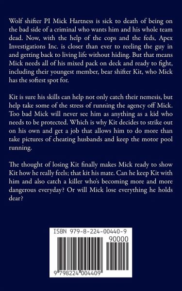 Wolf shifter PI Mick Hartness is sick to death of being on the bad side of a criminal who wants him and his whole team dead. Now, with the help of the cops and the feds, Apex Investigations Inc. is closer than ever to reeling the guy in and getting back to living life without hiding. But that means Mick needs all of his mixed pack on deck and ready to fight, including their youngest member, bear shifter Kit, who Mick has the softest spot for. Kit is sure his skills can help not only catch their nemesis, but help take some of the stress of running the agency off Mick. Too bad Mick will never see him as anything as a kid who needs to be protected. Which is why Kit decides to strike out on his own and get a job that allows him to do more than take pictures of cheating husbands and keep the motor pool running. The thought of losing Kit finally makes Mick ready to show Kit how he really feels; that kit his mate. Can he keep Kit with him and also catch a killer who's becoming more and more dangerous everyday? Or will Mick lose everything he holds dear?