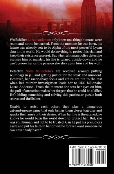 He hates her kind, but he can't resist the human NYPD detective who wants to put him in jailWolf shifter Lucas Anderson only knew one thing: humans were scum and not to be trusted. From the moment he was born, his future was already set: to be Alpha of the most powerful Lycan clan in the world. He would do anything to protect his clan and keep their existence a secret. But when a gorgeous,*human* police detective accuses him of murder, his life is turned upside-down and he can't ignore her or the passion she stirs up in him and his wolf. Detective Sofia Selinofoto's life revolved around putting scumbags in jail and getting justice for the weak and innocent. However, her razor-sharp focus and ethics are put to the test when her murder investigation leads her to CEO billionaire Lucas Anderson. From the moment she sets her eyes on him, the pull of attraction was so strong she almost forgets that he could be a killer. But, she knows he's hiding something and solving this particular puzzle both scares and thrills her. Unable to resist each other, they play a dangerous cat-and-mouse game that only brings them closer together and sparks the flames of their desire. When her life is threatened, he knew he would burn the world down to protect her. But, she was still human and not to be trusted. Can he put his prejudices aside and put his faith in her or will he forever want someone he can never truly have?