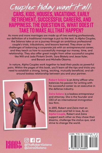 Couples today want it all: cars, kids, houses, vacations, early retirement, successful career, and happiness. The question is, what does it take to make all that happen? As more and more marriages are made up of two working professionals, our definition of a traditional marriage is put to the test. In Alpha Couples, the Solanos take us on a journey through an ambitious professional couple's trials, tribulations, and lessons learned. They show us the challenges of balancing a corporate job with an entrepreneurial career, and they teach us how to be successful in finances, time management, and with each other. They also offer great insight from other successful couples like Will and Jada Pinkett Smith, Sara Blakely and Jesse Itzler, and Barack and Michelle Obama. Alpha males are a thing of the past. Or, as the Solanos explain, maybe alpha males were never a thing to begin with. In nature, Alpha Couples work together to lead their packs as powerful pairs. Within the pages of this book, you'll learn all the tips and tricks you need to establish a strong, loving, exciting, mutually beneficial, and all-around badass relationship with you and your partner. Couples must read this book if they want to:Be a badass power couple Manage money as a couple and build generational wealth Balance an entrepreneur career and your relationship Work with your spouse as a true partner Reveal the secrets of mind-blowing sex Stop making excuses and live a spectacular life! Now with Bonus Chapter on SEX and INTIMACY! Robert Solano is a talented author who balances his passion for writing with his successful military career as an executive in the defense industry. Zaira Solano is a badass entrepreneur and attorney. She is the founder and CEO of an international immigration law firm. In 2013, Robert and Zaira met on Match.com and fell in love. As an Alpha Couple, Robert and Zaira support each other as they chase their dreams, challenge the status quo, and strive to change the world. In Alpha Couples, learn the tips and tricks you need to establish a strong, loving, exciting, mutually beneficial, and all-around badass relationship with you and your partner. Alpha Couples contains explicit language that may not be suitable for all audiences. This book has everything you need to be a badass Alpha Couple. Don't miss out on the opportunity to live a spectacular life. Get Alpha Couples today!