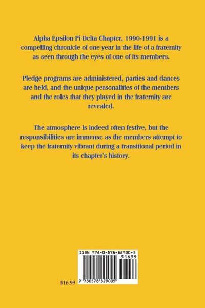 Alpha Epsilon Pi Delta Chapter, 1990-1991 is a compelling chronicle of one year in the life of a fraternity as seen through the eyes of one of its members. Pledge programs are administered, parties and dances are held, and the unique personalities of the members and the roles that they played in the fraternity are revealed. The atmosphere is indeed often festive, but the responsibilities are immense as the members attempt to keep the fraternity vibrant during a transitional period in its chapter's history.