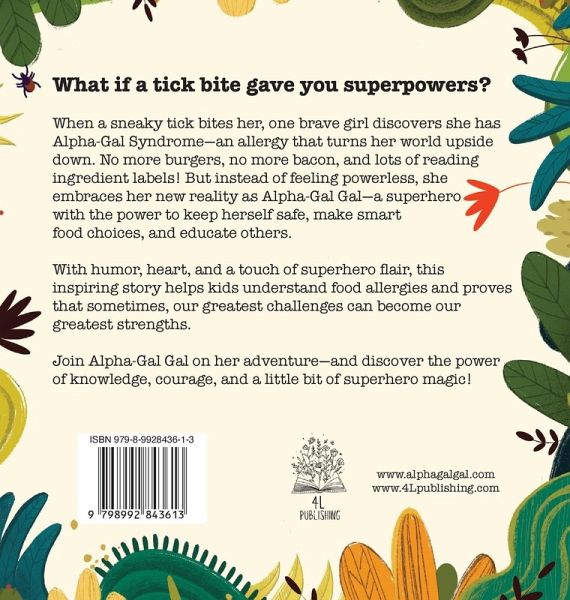 What if a tick bite gave you superpowers? When a sneaky tick bites her, one brave girl discovers she has Alpha-Gal Syndrome-an allergy that turns her world upside down. No more burgers, no more bacon, and lots of reading ingredient labels! But instead of feeling powerless, she embraces her new reality as Alpha-Gal Gal-a superhero with the power to keep herself safe, make smart food choices, and educate others. With humor, heart, and a touch of superhero flair, this inspiring story helps kids understand food allergies and proves that sometimes, our greatest challenges can become our greatest strengths. Join Alpha-Gal Gal on her adventure-and discover the power of knowledge, courage, and a little bit of superhero magic!