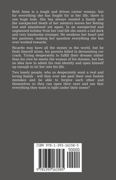 Beth Anne is a tough and driven career woman, but for everything she has fought for in her life, there is one huge hole. She has always wanted a family and the unexpected death of her mentors leaves her feeling lost and abandoned yet again. In an unexpected and unplanned holiday from her real life she meets a tall dark and very handsome stranger. He awakens her heart and her passions, making her question everything she has ever worked towards. Ricardo may have all the money in the world, but he finds himself alone, his parents killed in devastating car crash. Trying desperately to fulfill their dreams rather than his own he meets the woman of his dreams, but has no idea how to admit his real identity and open himself up enough to let her into his life. Two lonely people, who so desperately want a real and loving family - will they ever see past their own foolish mistakes and be able to forgive each other and themselves so they can open their eyes and see that everything they want is right under their noses?