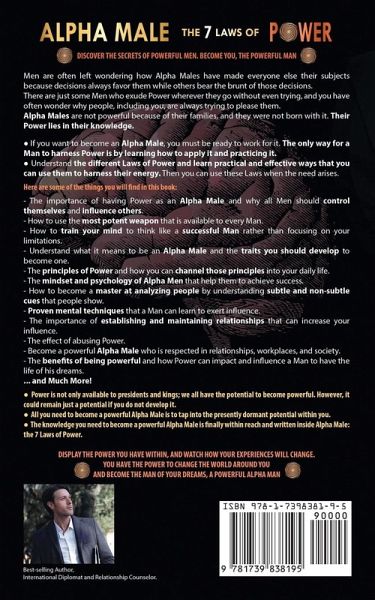 ¿DISCOVER THE SECRETS OF POWERFUL MEN and BECOME YOU ...THAT POWERFUL MAN¿ Men are often left wondering how Alpha Males have made everyone else their subjects because decisions always favor them while others bear the brunt of those decisions. There are just some Men who exude Power wherever they go without even trying, and you have often wonder why people, including you, are always trying to please them. They could basically repeat an idea that you raised that was shut down and get promoted. If the desire to feel powerful like Alpha Males is burning in you, Alpha Male: the 7 Laws of Power is the answer you need. Alpha Males are not powerful because of their families, and they were not born with it. Their Power lies in their knowledge. ¿ If you want to become an Alpha Male, you must be ready to work for it. The only way for a Man to harness Power is by learning how to do it and practicing it. ¿ Understand the different Laws of Power and learn practical and effective ways that you can use to harness various forms it has and use them when the need arises. Here are some of the things you will find in this book: ¿ The importance of having Power as an Alpha Male and why all Men should control themselves and influence others. ¿ How to use the most potent weapon that is available to every Man. ¿ How to train your mind to think like a successful Man rather than focusing on your limitations. ¿ Understand what it means to be an Alpha Male and the traits you should develop to become one. ¿ The principles of Power and how you can channel those principles into your daily life. ¿ The mindset and psychology of Alpha Men that help them to achieve success. ¿ How to become a master at analyzing people by understanding subtle and non-subtle cues that people show. ¿ Proven mental techniques that a Man can learn to exert influence. ¿ The importance of establishing and maintaining relationships that can increase your influence. ¿ The effect of abusing Power. ¿ Become a powerful Alpha Male that is respected in relationships, workplaces, and society. ¿ The benefits of being powerful and how Power can impact and influence a Man to have the life of his dreams. ... and Much More! ¿ Power is not only available to presidents and kings; we all have the potential to become powerful. However, it could remain a potential if you do not develop it. ¿ All you need to become a powerful Alpha Male is to tap into the presently dormant potential within you. ¿ The knowledge you need to become a powerful Alpha Male is finally within reach and written inside Alpha Male: the 7 Laws of Power. Display the Power you have within and watch how your experiences will change. ¿You have the Power to change the world around you and become the Man of your dreams, a Powerful ALPHA MAN¿