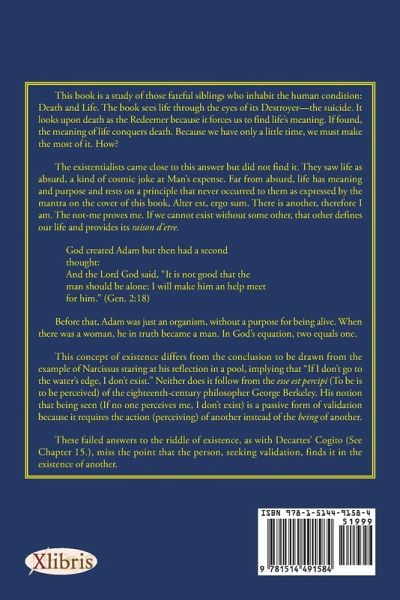 I. DEATH After a long, frightening journey, a Seeker of Truth reaches the top of a mountain and finds the cave of the Wise One. He says, "O, Wise One, I have come many miles and suffered many hardships, to ask you one question." "Ask," says the Wise One. "What is the meaning of life?" says the pilgrim. The Wise One pauses, smiles slightly, and replies. "You have come far and seem to me worthy, so I shall give you what you seek-the truth. The answer is in your question and this journey is your life. Go back down the mountain. When you arrive, you will know how much time you have wasted, and you will have no more time left. So, give me your watch." Why is life so mysterious, and why is its purpose so elusive to us? It may be that we have looked for the meaning of life in the wrong places as though in a nightmarish scavenger hunt arranged by the Prince of Darkness himself. From one moment to another, we thought it was money or power or fame or honor or comfort or some other pleasure of the flesh, only to see them, finally, as false clues leading to a mountain we shouldn't have climbed. This book records an inquiry that found the meaning of life by discovering the meaning of death. This is reflected in the words and behavior of those who decide to die: the suicides. These poor souls have much to teach us, for they have measured out for us the value of death, from which we can calculate the value of life. So a study of suicide leads to the truth about life-yours and mine. This book guides you to that revelation. The surprise of the book is that you will discover that you knew it all along. The promise of the book is that you will know that you know. II. LIFE The relationships that a person has with other people are the central core of that person's existence. The people you meet, the members of your family, those whom you love, and even your sworn enemy are the motivating forces behind everything you do and the reason for your stay on this planet. In short, the meaning of life is relationship. What if life were relationship, pure and simple, the end and the beginning? If life is relationship, it is not wealth or fame. It is not winning or acquiring or what you accomplish or where you live or how much education you have or the honors you have been given. It is not how law-abiding you are or how devout you are in your religious faith. Your "worth" is measured not by your bank account, the property in your name, or the trust you established for your child or children. Your worth is measured by the relationships you have formed in your lifetime and the care with which you have conducted them and the way that you treated those other persons. This view of people as enmeshed in relationships with others living in, by, and for them rejects the Cult of Self and the selfishness nourishing that demon. Your life's meaning is before your eyes each day. In every encounter that you have with another person, every word or glance or touch, life reaches out and embraces you and fulfills your purpose for being here.