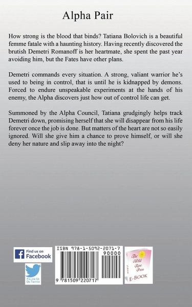 How strong is the blood that binds? Tatiana Bolovich is a beautiful femme fatale with a haunting history. Having recently discovered the brutish Demetri Romanoff is her heartmate, she spent the past year avoiding him, but the Fates have other plans. Demetri commands every situation. A strong, valiant warrior he's used to being in control, that is until he is kidnapped by demons. Forced to endure unspeakable experiments at the hands of his enemy, the Alpha discovers just how out of control life can get. Summoned by the Alpha Council, Tatiana grudgingly helps track Demetri down, promising herself that she will disappear from his life forever once the job is done. But matters of the heart are not so easily ignored. Will she give him a chance to prove himself, or will she deny her nature and slip away into the night?